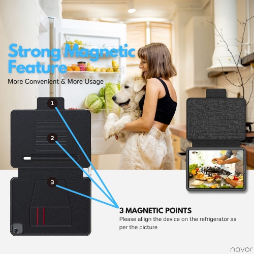 SECURE MOUNTING Mount your iPad on the fridge with powerful magnets or hang it on a hook with the sturdy cutout.