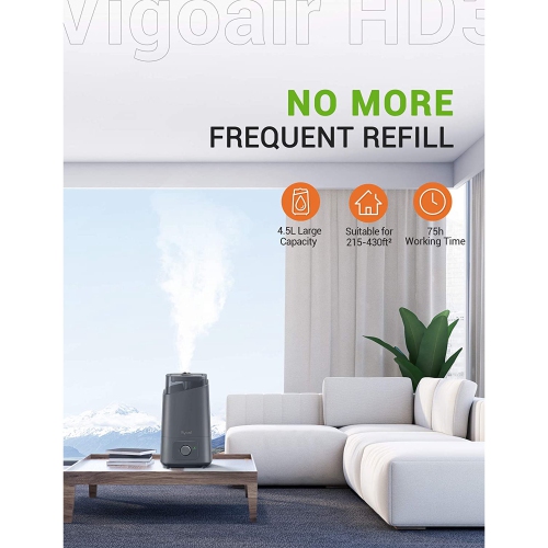Vigoair HD3 humidifier comes with a 1.2Gal/4.5L large tank and super long runtime of up to 75 hours, saving you the trouble of frequent refilling.
