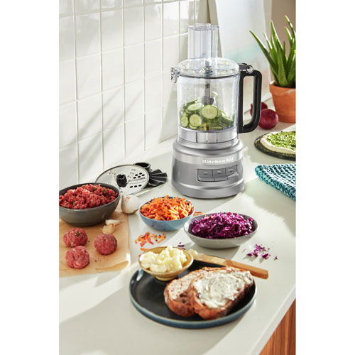 Includes a nine-cup work bowl, lid with two-in-one feed tube, multipurpose four blade, reversible slicing/shredding disc, whisk accessory, refrigerator lid, and dough blade