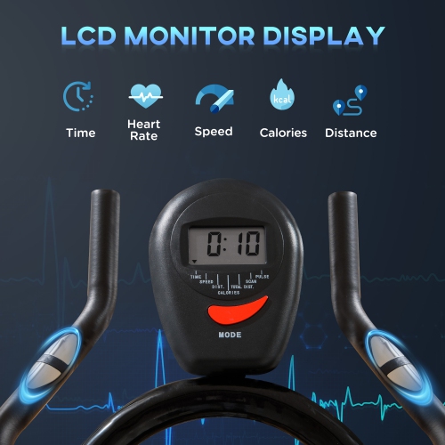 ● LCD shows time, speed, distance, heart rate, calories