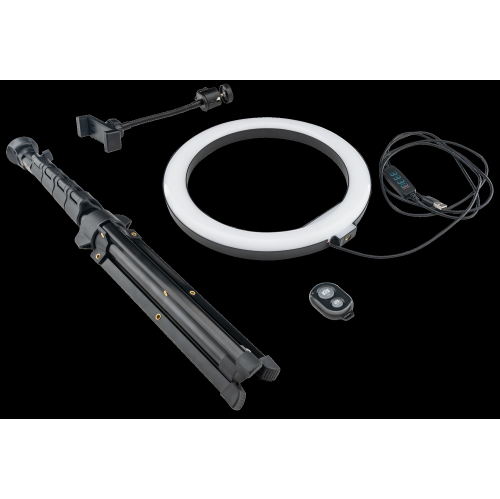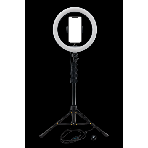 mRING-10 is a 10" diameter ring light that is perfect for content creators, remote work, streaming, and more on mobile devices. With the included telescoping stand you are good to go right out of the box plus the Bluetooth[reg] remote makes it easy to start your video without having to reach your phone.