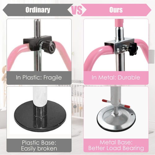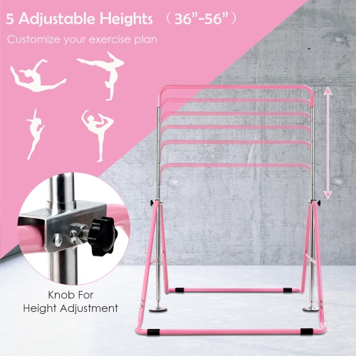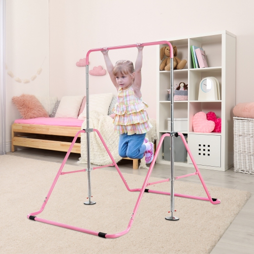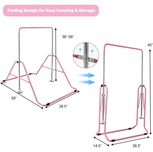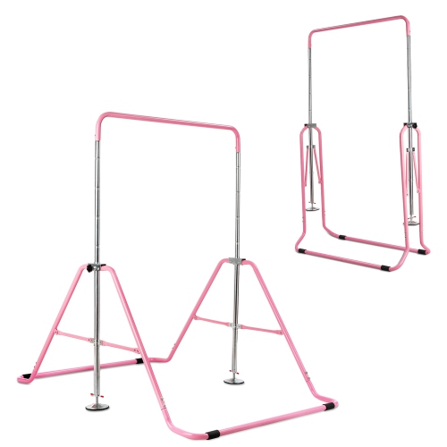 This gymnastics training bar will benefit your kids a lot in their growth process! Our expandable gymnastics bar is suitable for children aged 3-7. With five adjustable heights design, kids of different heights, needs and skill levels can find their best position to do exercises. Constructed in sturdy steel triangular structure, this kids training bar has high stability and durability, bearing up to 150lbs. The two round bases at both sides and four non-slip pads can effectively reduce its shaking and enhance the overall stability. You can easily fold it into a compact size and store it in narrow space. It will surely give your children a happy childhood and help them build up courage and confidence!