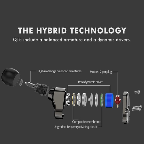 DUAL DRIVERS - QT5 In-Ear Headphones include a balanced armature and a dynamic drivers.Not only have unique design,but also deliver superior hifi sound quality and deep bass,high treble is clear and delicate,bring you a shock auditory sense. PATENTED DESIGN & ERGONOMIC FIT - Application for Europe and USA patent.Naturally fit the ear canal, it's comfortable to wear and not easy to fall off. Comfortable wear comes from excellent ergonomic design. METAL HOUSING - Heavy metal housing design, a strong sense of metal Visually,exceptional noise Isolating design and the silicone earbuds allow you to fully immerse into your music. COMPATIBLE MODEL - The cable use 3.5MM 0.78mm 2 pin Detachable Hifi Audio Cable.Suitable for most smartphones. CONTENTS - 1 x QT5 Dual Driver In-Ear Headphones,3 x Silicone Ear Tips(3 Pairs),1 x 3.5MM 0.78mm 2 pin Detachable Cable,1 x User Manual.Finally,you will get 12 months warranty and friendly customer service from the date of purchase if you orde