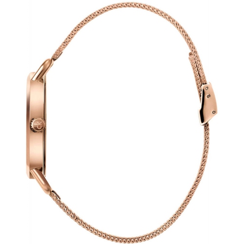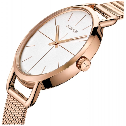 Rose gold PVD stainless steel case with a rose gold PVD stainless steel mesh bracelet. Fixed rose gold PVD bezel. White dial with luminous rose gold-tone hands and index hour markers. Dial Type: Analog. Luminescent hands. Quartz movement. Scratch resistant mineral crystal. Pull / push crown. Solid case back. Round case shape. Case size: 36 mm. Case thickness: 8 mm. Band width: 14 mm. Fold over slip through clasp. Water resistant at 30 meters / 100 feet. Functions: hour, minute. Even Series. Casual watch style. Watch label: Swiss Made. Calvin Klein Even Quartz White Dial Ladies Watch K7B23626.