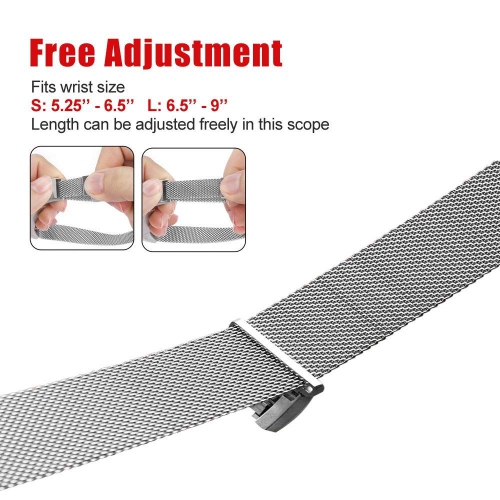 Compared with traditional ones, this strong magnet closure is far quicker and easier to secure the band by just contacting the band at once. And it is free to adjust the length of band in wrist scope: 5.25" - 6.5" (Small Size)/ 6.5" - 9" ( Large Size)