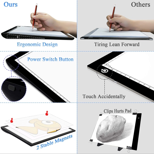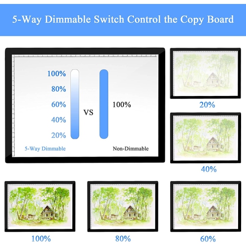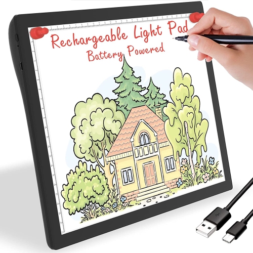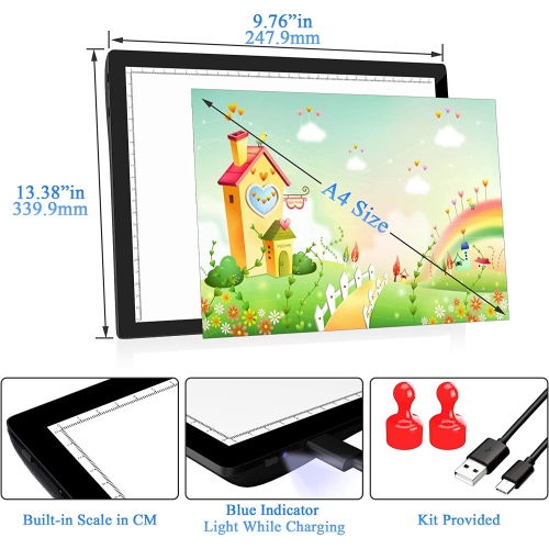 (Rechargeable Light Board for Tracing)-- cordless tracing light box is portable and battery powered. With the built-in lithium battery of 2500mAh, the copy board could be taken everywhere without connecting to power plug. Working freely up to 6 hours continuously at its max brightness by charging for only 2 hours. Could be powered up by wall charger, power bank, computer, car charger and so on. (Dimmable Copy Board & Eye-Protection)-- LED Light Pad for sketching is of 5 levels' adjustable brightness. In order to meet different needs of working, we have 5 levels of brightness from dim to bright. The illumination is perfectly average and it's flicker-free. Advanced eyesight-protected technology makes it no more sore eyes after long-hour working. (Portable Tracing Board & Built-in Scale)--The cordless ultra-fin tracing pad is of 340*249*18mm, slightly larger than A4 paper, its slime design make it easy to carry outside. Comes with type-C USB cable (1.5m), and the pow