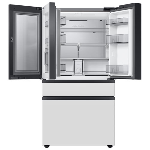• French door fridge design lets you open just one door for a quick snack and easily store large platters