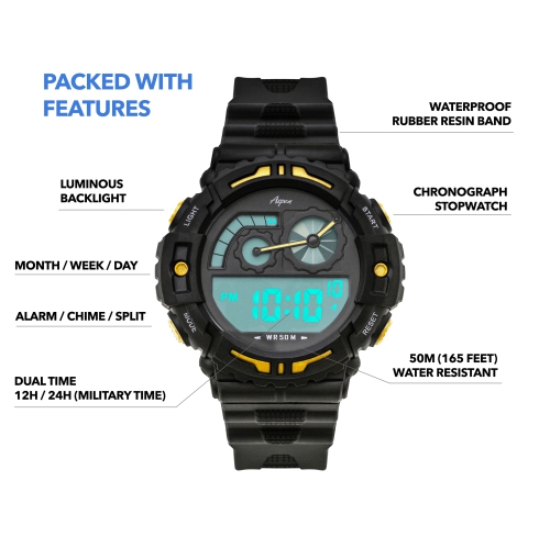 • QUALITY, DURABLE & WATER RESISTANT: Aspen digital wrist watches are built with a high quality, very precise Citizen Miyota Japanese quartz. Watch casing is rugged, made to absorb shock and is 5 ATM (50 meters) water resistant (Not recommended for swimming, diving and snorkelling). Perfect everyday sports watch for fitness and outdoor recreation. Ideal gift for runners, gym goers Police Officers, MIlitary Officers, Nurses, etc or anyone who enjoys sports.