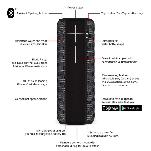 Pump up the jam with the Ultimate Ears MEGABOOM Bluetooth Wireless Speaker in charcoal black. This cylindrical speaker sends audio in all directions thanks to a pair of 2" drivers and two 2 x 4" passive radiators. It connects to up to two devices simultaneously via Bluetooth and can remember up to eight. Two MEGABOOMs can be used at once with a single device.