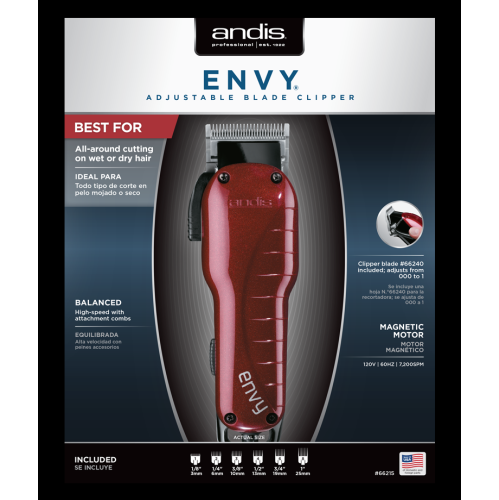 The andis envy hair clipper is a high-speed, adjustable clipper for all-around styling. The powerful motor generates over 7200 cutting strokes per minute. The envy is ergonomically-designed and feels small and light in your hand. It easily cuts wet or dry hair and runs whisper quiet. A single lever adjusts blade from fine to coarse and the hanger loop allows for easy and convenient storage.