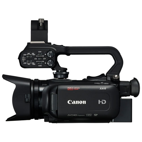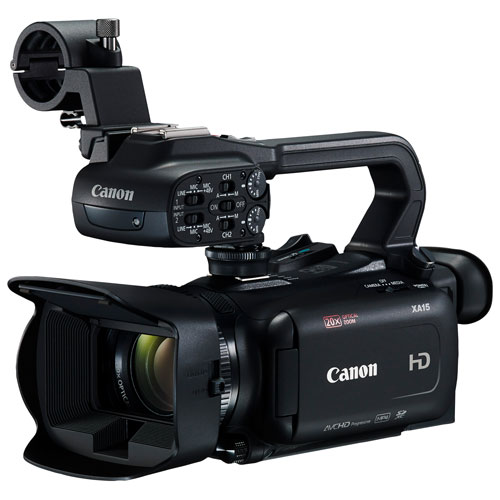 Includes camcorder, lens hood with barrier, BP-820 battery pack, CA-570 compact power adapter, HDU-1 handle unit, and mic holder