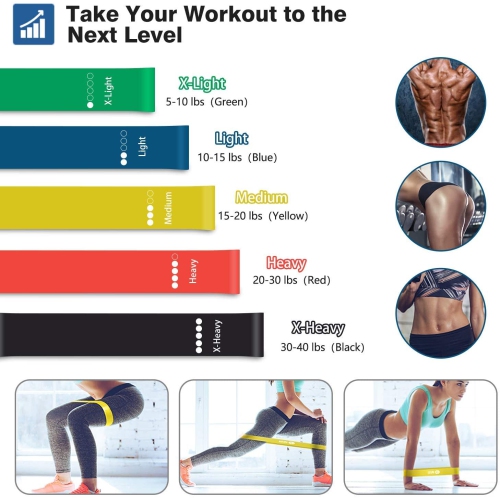 5 x Resistance loop bands ( Green=X-Light, Blue=Light, Yellow=Medium, Red=Heavy, Black=X-Heavy )