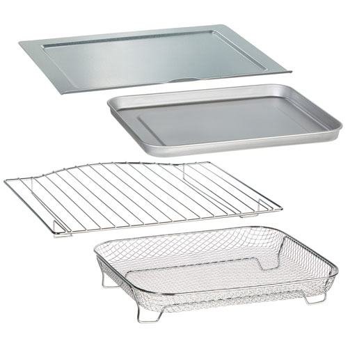 Includes a metal mesh basket for air frying, a baking pan, a broil rack, and a slide-out crumb tray