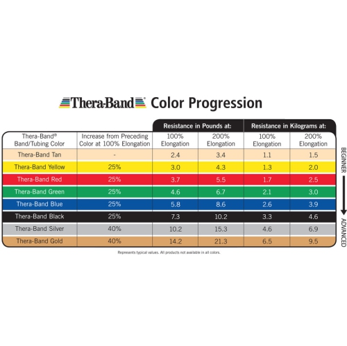 Thera-Band® latex Exercise Bands are available in 8 color-coded levels of resistance. Improve strength, range of motion and cooperation of muscle groups. Color-coded progressive resistance gives at-a-glance documentation of progress from one level to the next. Resistance levels are determined by thickness of the Theraband, increasing in difficulty from tan (Extra Thin) to gold (Max).