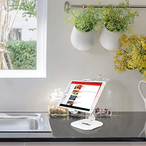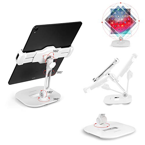 [FLEXIBLE ADJUSTMENT] 360° rotation holder and arm base plus 180° arm-folding range gives numerous multi-angle viewing possibilities in all dimensions. A must-have iPad stand for home entertainment, shop showcasing, and office display. Perfect hands-free convenience for seniors at home enjoying modern technology.