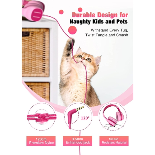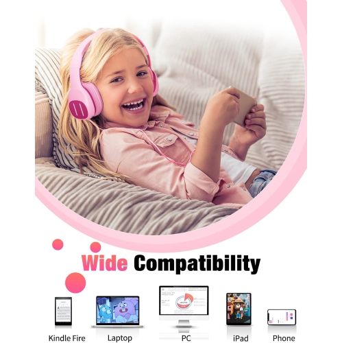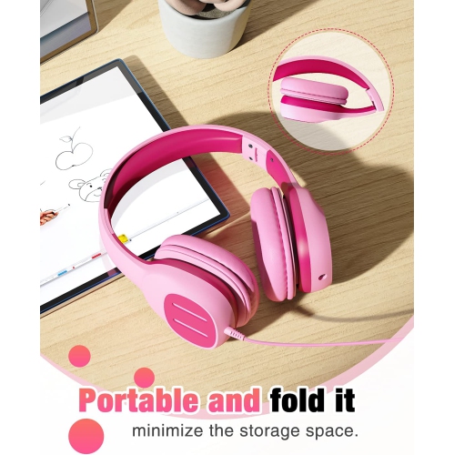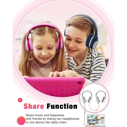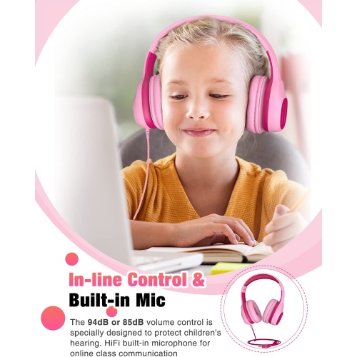 [Built-in Microphone & Wide Compatibility]: Upgraded In-line Microphone designed for Virtual-Classroom Interaction. Headphones for School Kids is the perfect choice for remote learning and home-schooling. Compatible with all devices with 3.5mm audio port including Chromebook, Kindle Fire, Playstation or Switch controller, iPad, laptop, PC, etc. [Wired Children Headphone with Share Port]: HiFi Stereo Sound quality adopted by over-ear headphones,3.5mm extra share port can link two headphones to one device, let two kids study online or watch movie together. Parents can listen to something else while the kids are amused on the computer, tablet, phone or TV. [85dB/94dB Safe Volume Limited]: kids headset with specially designed 85/94dB volume limit switch, helps protecting children's hearing. Keep 85dB for long-term online studying, and change to 94dB in a noisy environment like long-haul flights or road trips. [Foldable Comfortable Girls Headphones]: Ultra-soft ea