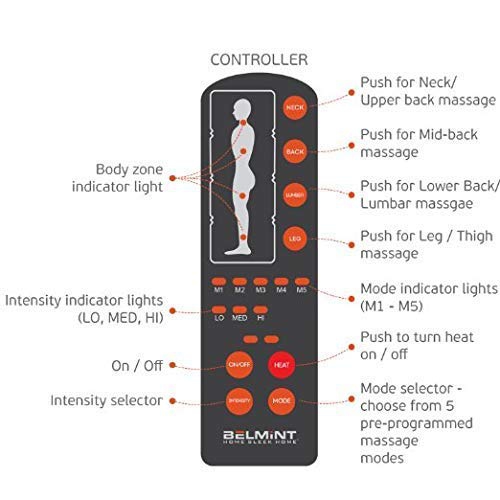 • Control intensity levels - The Belmint body massager has five pre-programmed modes, four independently controllable zones, and three intensity levels. All modes and levels can be modified using the handheld controller which is easy to operate. The side pouch on the mat accommodates handheld controller to prevent unwanted changes.