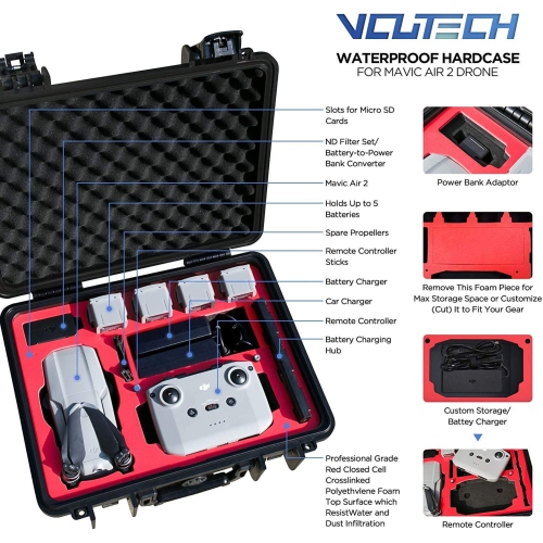 * Designed to carry everything of your Mavic Air 2/Air 2S fly more combo and more: 2 more batteries, iPad holder, car charger, lens filters. VCUTECH landing pad can also be perfectly placed between this waterproof hardcase without squeezing other drone parts