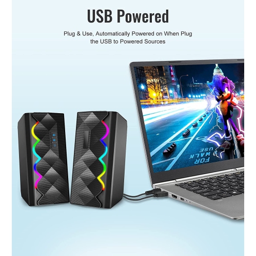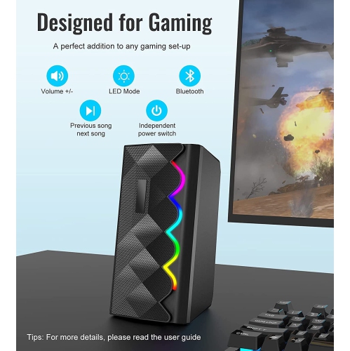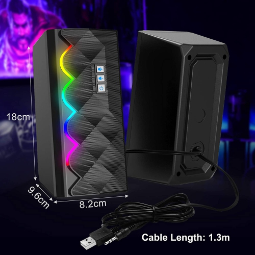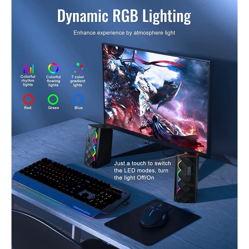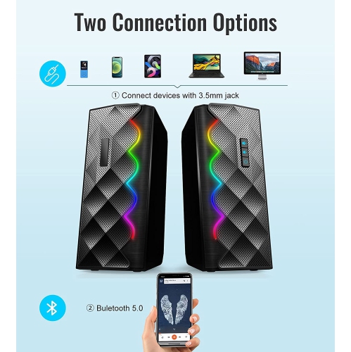 √️2 in 1 AUX & Bluetooth PC Speakers: Not only a usb wired pc speaker, but also a great Bluetooth 5.0 speaker.Work with any audio devices with 3.5mm and equipped Bluetooth function. √️ 6 Touch Controlled RGB Lights: The sound quality is solid, and the wave lighting bar is attractive. 6 modes are choosable for different vibes by touch-control, switch off the light is also available. √️Enhanced Clear Bass: Equipped with advanced sound drive unit with full range 2.0 channel enhanced stereo core, S500 offers you superior clear and rich sound. √️Modern design & Easy to Use : Metal mesh cover, elegant appearance and just plug and play. The USB cable for power and the 3.5MM aux in cable for the sound or bluetooth connection directly. Easy-access Volume Control - Individual volume up and volume down buttons make adjusting the volume easy and accurate. √️Compact Size & Broad Compatibility : Size with 9.6 x 8.2x 18 cm (L x W x H), 1.6 pounds. Compatible with iPhone,Tablets, Smart phones, p