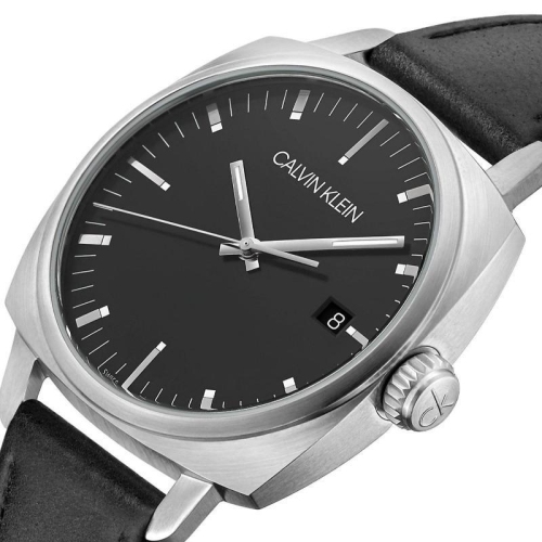 Stainless steel case with a black leather strap. Fixed stainless steel bezel. Black dial with luminous silver-tone hands and index hour markers. Minute markers around the outer rim. Dial Type: Analog. Luminescent hands and markers. Date display at the 3 o'clock position. Quartz movement. Scratch resistant mineral crystal. Pull / push crown. Solid case back. Tonneau case shape. Case size: 39 mm. Case thickness: 11 mm. Band width: 18 mm. Tang clasp. Water resistant at 30 meters / 100 feet. Functions: date, hour, minute, second. Fraternity Series. Casual watch style. Watch label: Swiss Made. Calvin Klein Fraternity Quartz Black Dial Men's Watch K9N111C1.