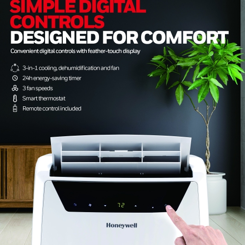 Enjoy a simple-to-use digital control with 3 fan speeds, a 24-hour energy-saving timer, and a remote control (batteries included).