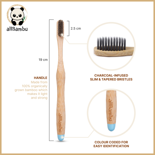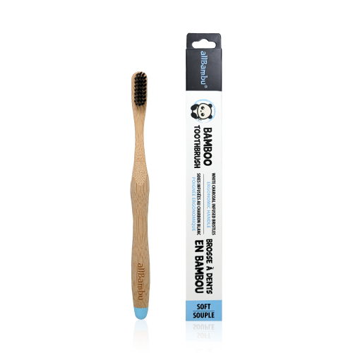 Made from organically grown bamboo, our eco-friendly sustainable bamboo toothbrushes are licensed by Health Canada.The BPA-free, vegan, bristles are infused with premium activated white charcoal (Binchotan from Japan) and have powerful antibacterial properties that cleans, whitens and brightens your teeth naturally and guarantees you great oral hygiene. Each toothbrush is individually sealed in compostable PLA wrapper inside our box packaging as an additional safety and hygiene measure.Stylish contoured smooth handle provides maximum grip comfort, the head is favourably sized and designed for optimal tooth coverage.
