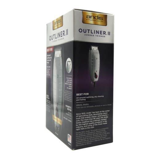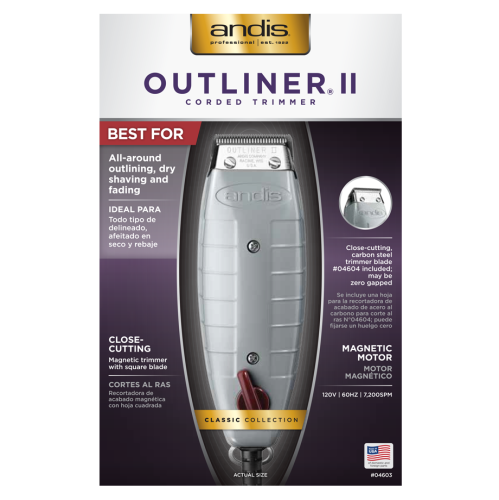 ·The Andis Professional Outliner II Square Blade Trimmer is a high-performance trimmer equipped with a close-cutting blade with fine-cutting teeth for extreme close cutting and crisp outlines/designs. It is contoured to perfectly fit your hand and is ideal for dry shaving and all-around outlining, fading, trimming necks, beards, mustaches, and edging around ears.