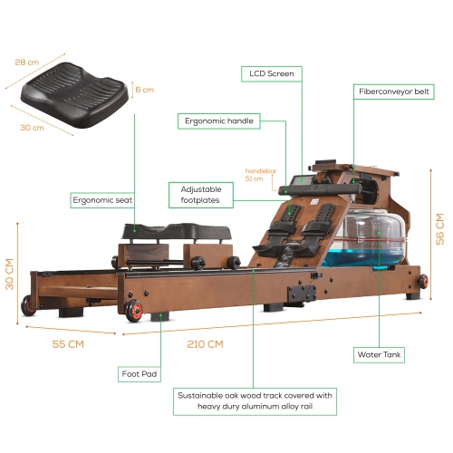 COMFORTABLE WORKOUT - Make the most out of your workout as it comes with an ergonomic seat, active recoil system, and height adjustable footplates with straps. The water rowing machine operates quietly, with mostly just the swooshing sound of the water.