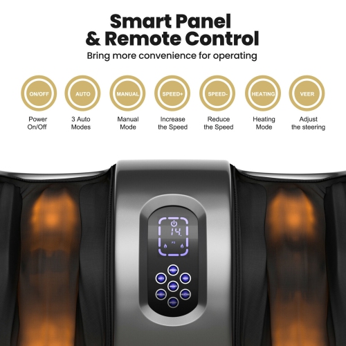 Our foot/calf/leg/arm/ankle massager comes with 3 auto modes and a manual mode that allows you to custom your massage experience with 3 speed intensities and a steering function. More than that, there exist a 3D massage system to fully relieve your sole, heel, and arch with deep kneading, rolling, shiatsu, and scraping massage. It also features a heating system with comfy heat (maximum running temperature: 104℉) to promote blood circulation and relieve tired muscles. Furthermore, the electric deep rolling massager is equipped with an LCD screen and a remote control for clear viewing and easy control, providing a more convenient environment for people with reduced mobility. The multifunctional foot massager can be the perfect gift to your loved ones!
