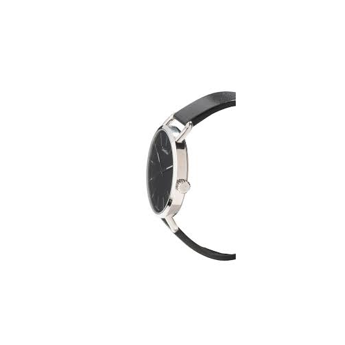 Stainless steel case with a black leather strap. Fixed stainless steel bezel. Black dial with luminous silver-tone hands and index hour markers. Dial Type: Analog. Luminescent hands. Quartz movement. Scratch resistant mineral crystal. Pull / push crown. Solid case back. Round case shape. Case size: 42 mm. Case thickness: 7 mm. Band width: 18 mm. Tang clasp. Water resistant at 30 meters / 100 feet. Functions: hour, minute. Even Series. Casual watch style. Watch label: Swiss Made. Calvin Klein Even Quartz Black Dial Ladies Watch K7B211C1.