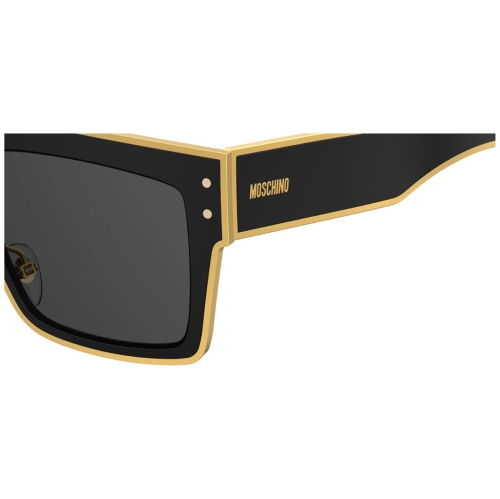 Moschino Sunglasses. Color code: 0807 IR. Size: 54. Shape: Rectangular. Lens Width: 54 mm. Lens Bridge: 19 mm. Arm Length: 150 mm. 100% UV protection. Non-Polarized. Frame Material: Metal. Frame Color: Black, Gold. Lenses Type: Grey. UPC/EAN code: 716736012926. Moschino Grey Rectangular Ladies Sunglasses MOS001/S 0807 IR 54.
